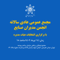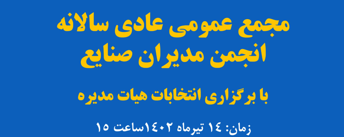مجمع عمومی عادی سالانه انجمن مدیران صنایع با دستور جلسه مندرج در در روزنامه اطلاعات مورخ دوشنبه 29 خرداد 1402 همراه با برگزاری انتخابات هیات مدیره از ساعت 15 روز چهارشنبه 14 تیرماه 1402 در محل مجتمع فرهنگی- رفاهی سازمان برنامه و بودجه واقع در تهران، میدان تجریش، خیابان شهید برادران فناخسرو (دربند سابق)، پلاک 52 برگزار می­شود.
