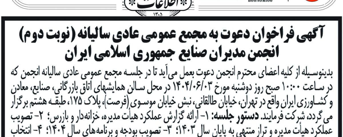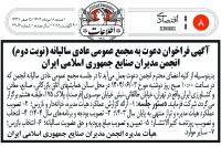 🔹بدینوسیله از اعضای محترم انجمن جهت حضور در جلسه مجمع عمومی عادی سالیانه که در محل سالن اجتماعات اتاق بازرگانی، صنایع، معادن و کشاورزی ایران واقع در خیابان طالقانی نبش خیابان شهید موسوی (فرصت) شماره ۱۷۵ طبقه هشتم تشکیل می‌شود، دعوت به عمل می‌آید.