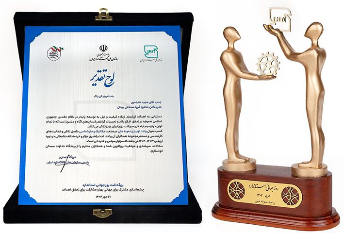در مراسم بزرگداشت روز جهانی استاندارد که با حضور رئیس جمهور و جمعی از مقامات عالی رتبه کشور، برگزار گردید، گروه صنعتی بوتان موفق به کسب عنوان ارزشمند “واحد نمونه ملی سال 1404 ” شد.