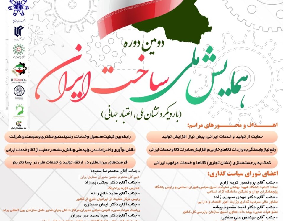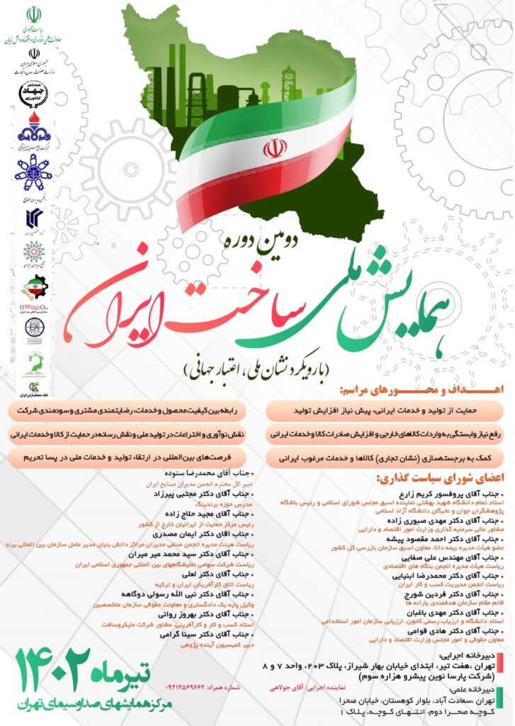 دومین دوره همایش ملی ساخت ایران با رویکرد نشان ملی، اعتبار جهانی تیرماه 1402، مرکز همایشهای صدا و سیمای تهران اهداف و محورهای مراسم: حمایت از تولید و خدمات ایرانی، پیش نیاز افزایش تولید رفع نیاز وابستگی به واردات کالاهای خارجی و افزایش صادرات کالا و خدمات ایرانی کمک به برجسته سازی (نشان تجاری) کالاها و خدمات مرغوب ایرانی رابطه بین کیفیت محصول و خدمات، رضایتمندی مشتری و سودمند []